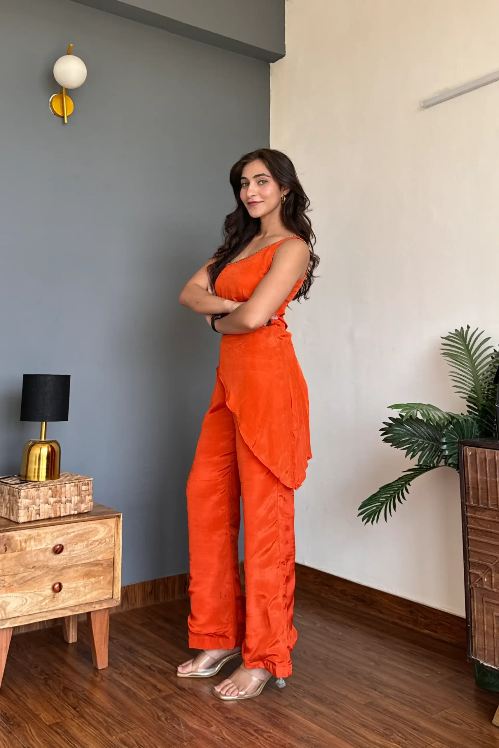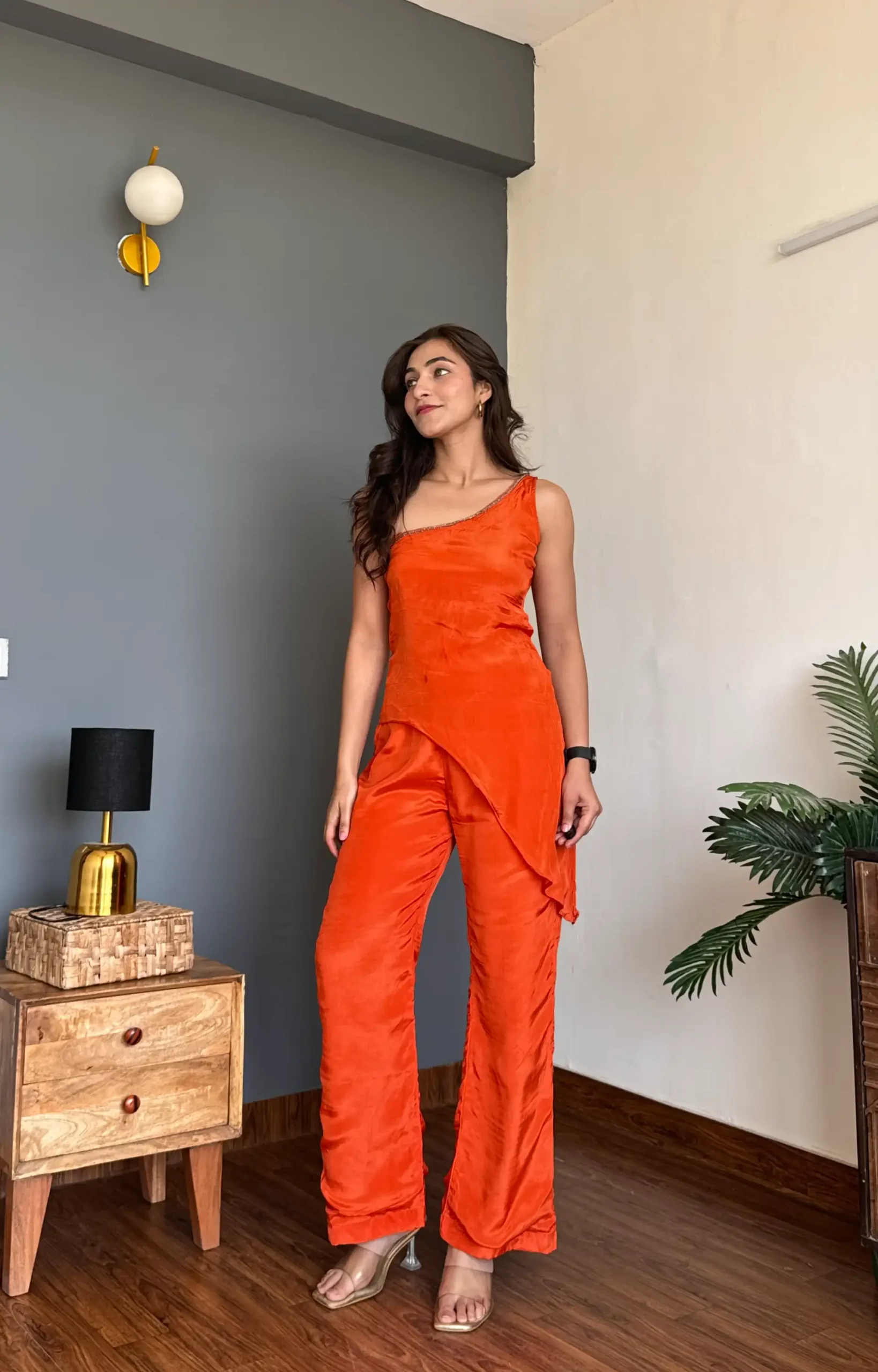 Rust one shoulder top featuring an asymmetric hem and cut dana hand work on the neckline. Paired with bell bottom pants for a coordinated look